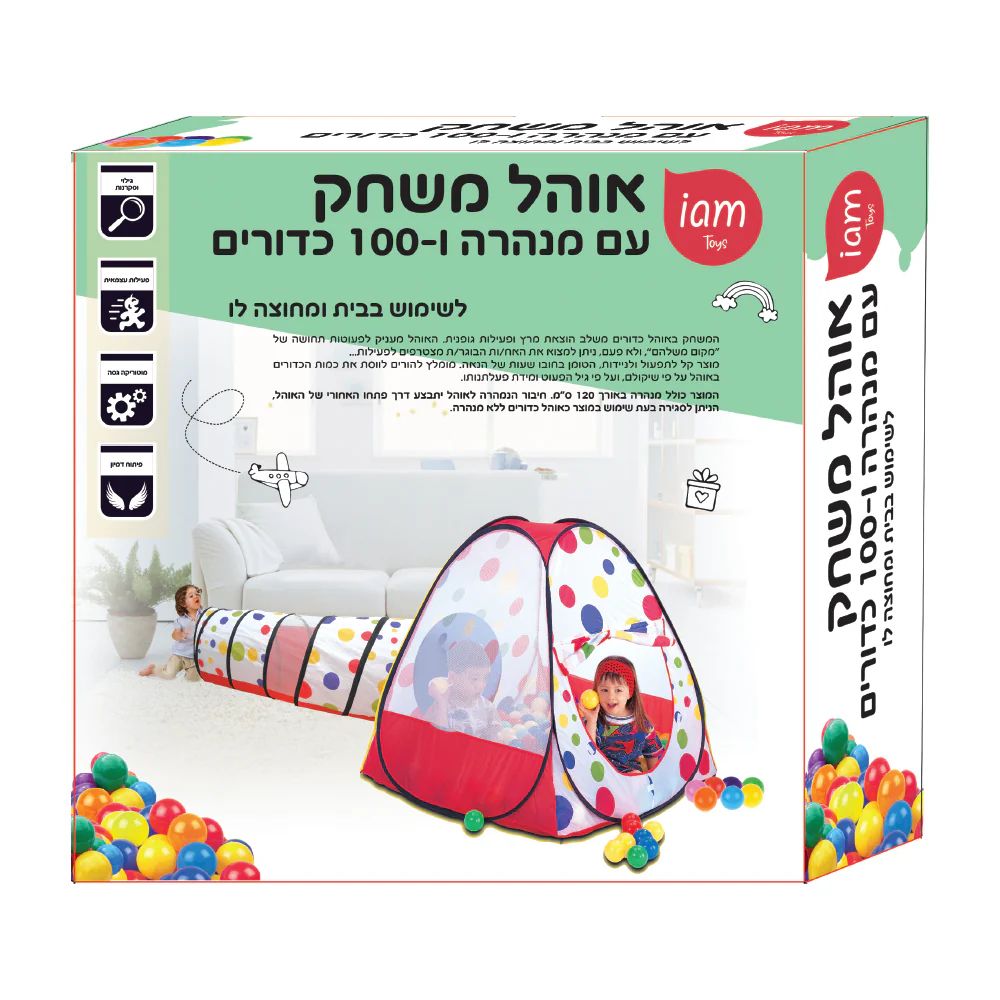 האוהל מציע שתי אפשרויות משחק – אוהל כדורים ואוהל עם מנהרה – המשלבים פעילות גופנית, דמיון והוצאת מרץ בריאה.