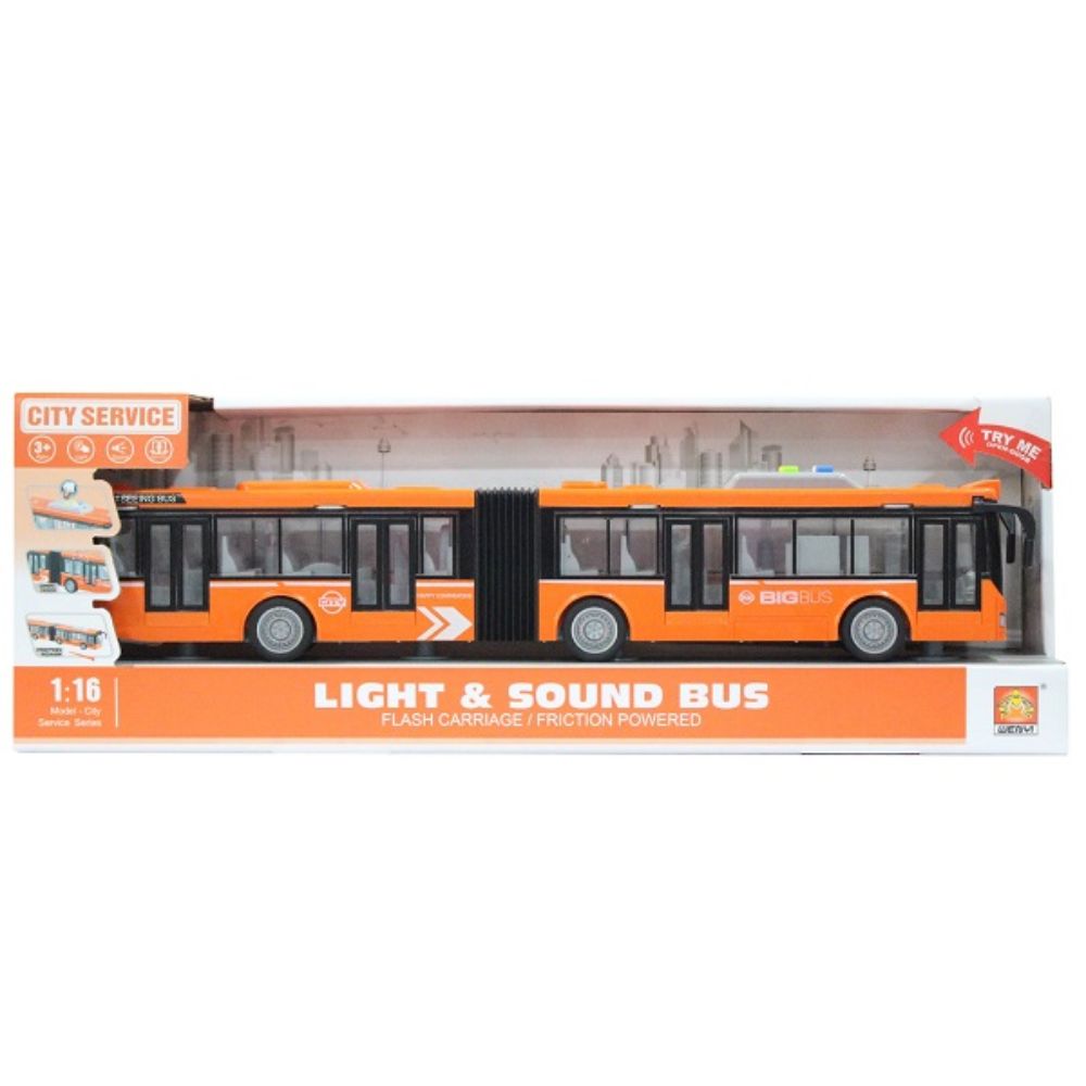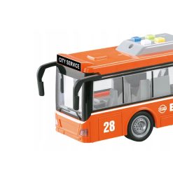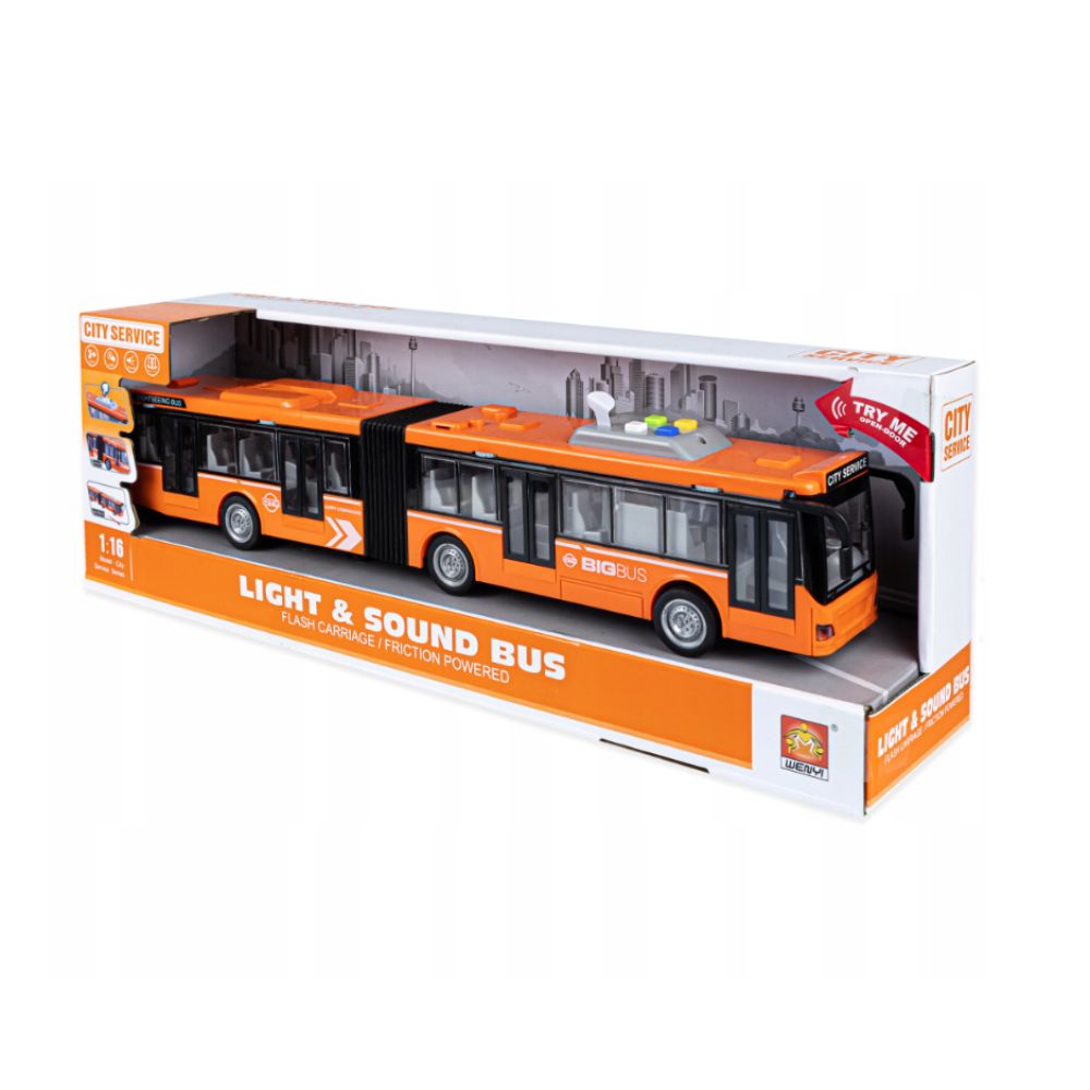 אוטובוס צעצוע עם מנגנון תנועה אחרי דחיפה, דלתות נפתחות ידנית, 4 כפתורי צליל ותאורה פנימית. מתאים לילדים מגיל 3+, כולל סוללות.