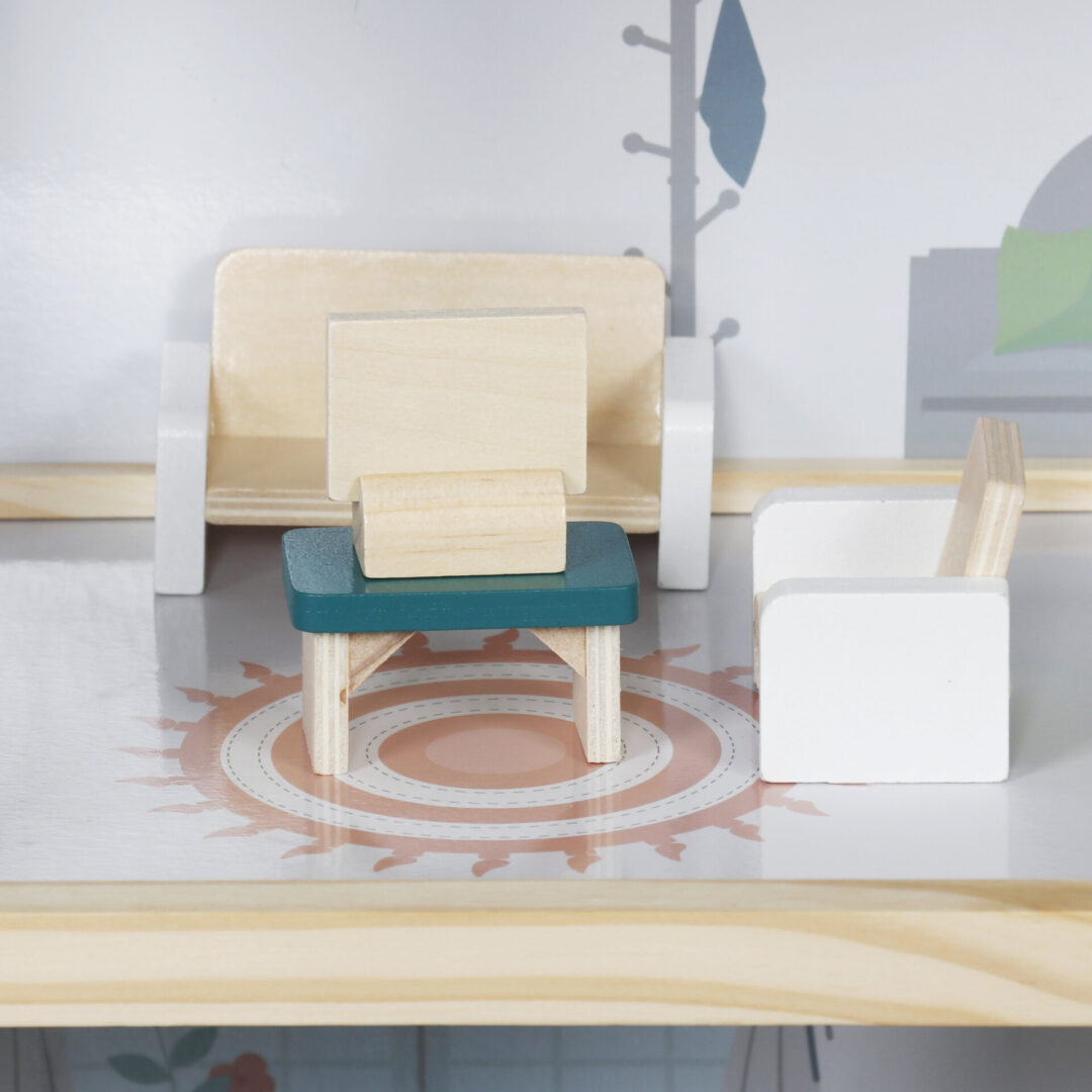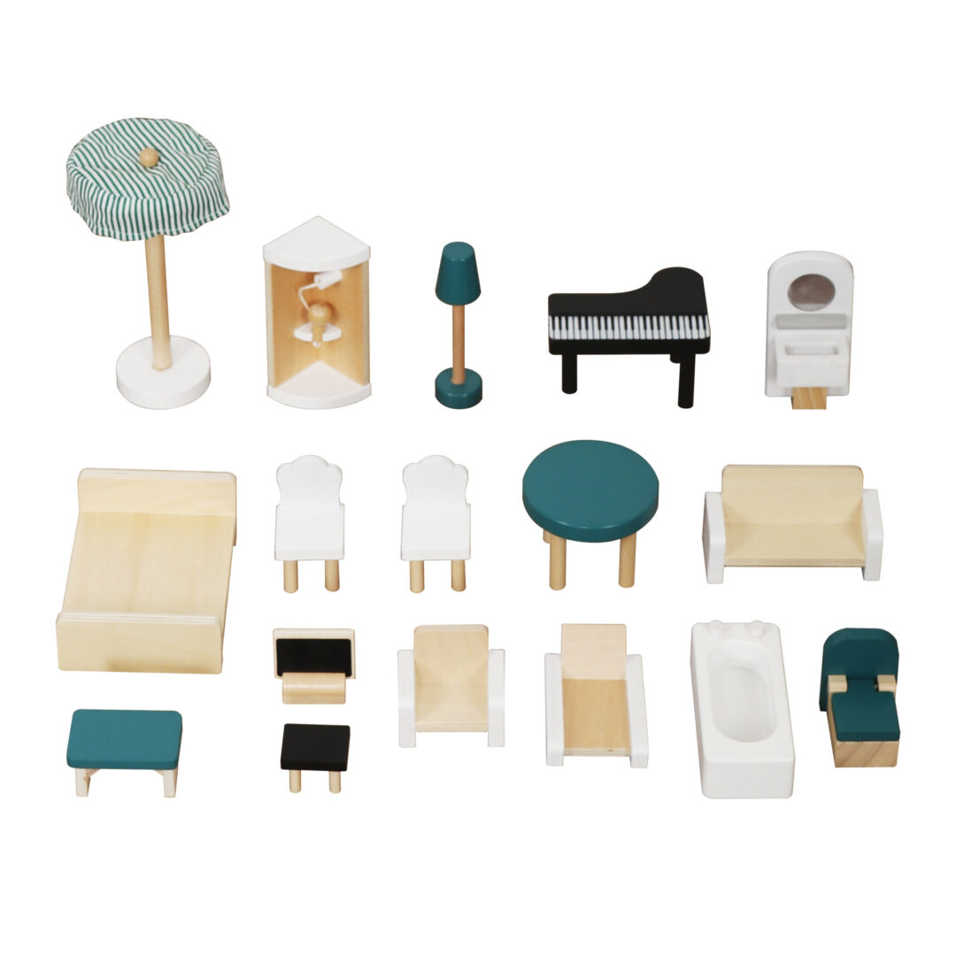 כולל ספה לסלון, מנורה, שולחן מטבח, כיסאות, אמבטיה, שירותים, פסנתר, ספסל, מטריית פטיו ושידת לילה. האביזרים מאפשרים משחק דמיוני עשיר ומיידי – ילדים יכולים להתחיל לשחק ישר מהקופסה.