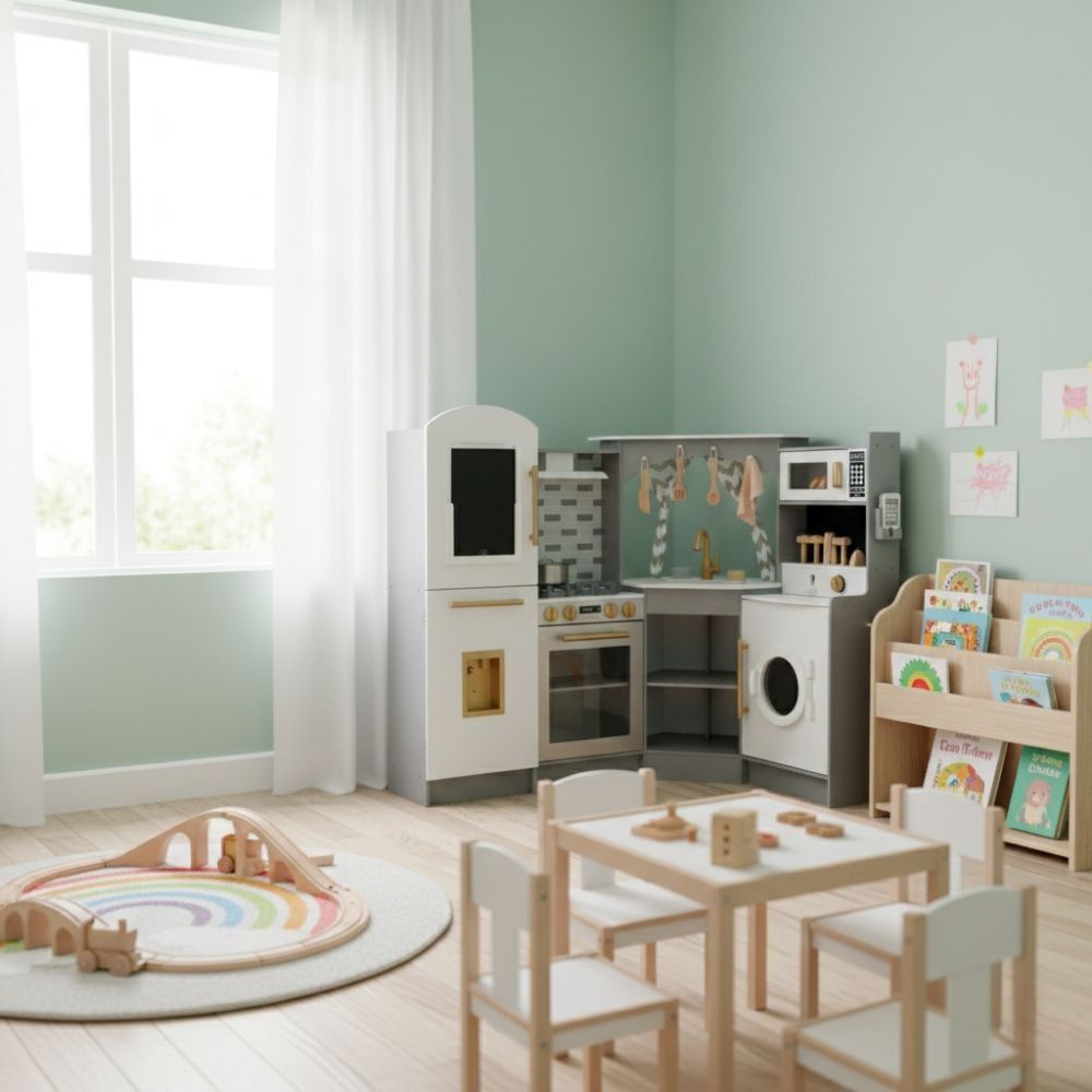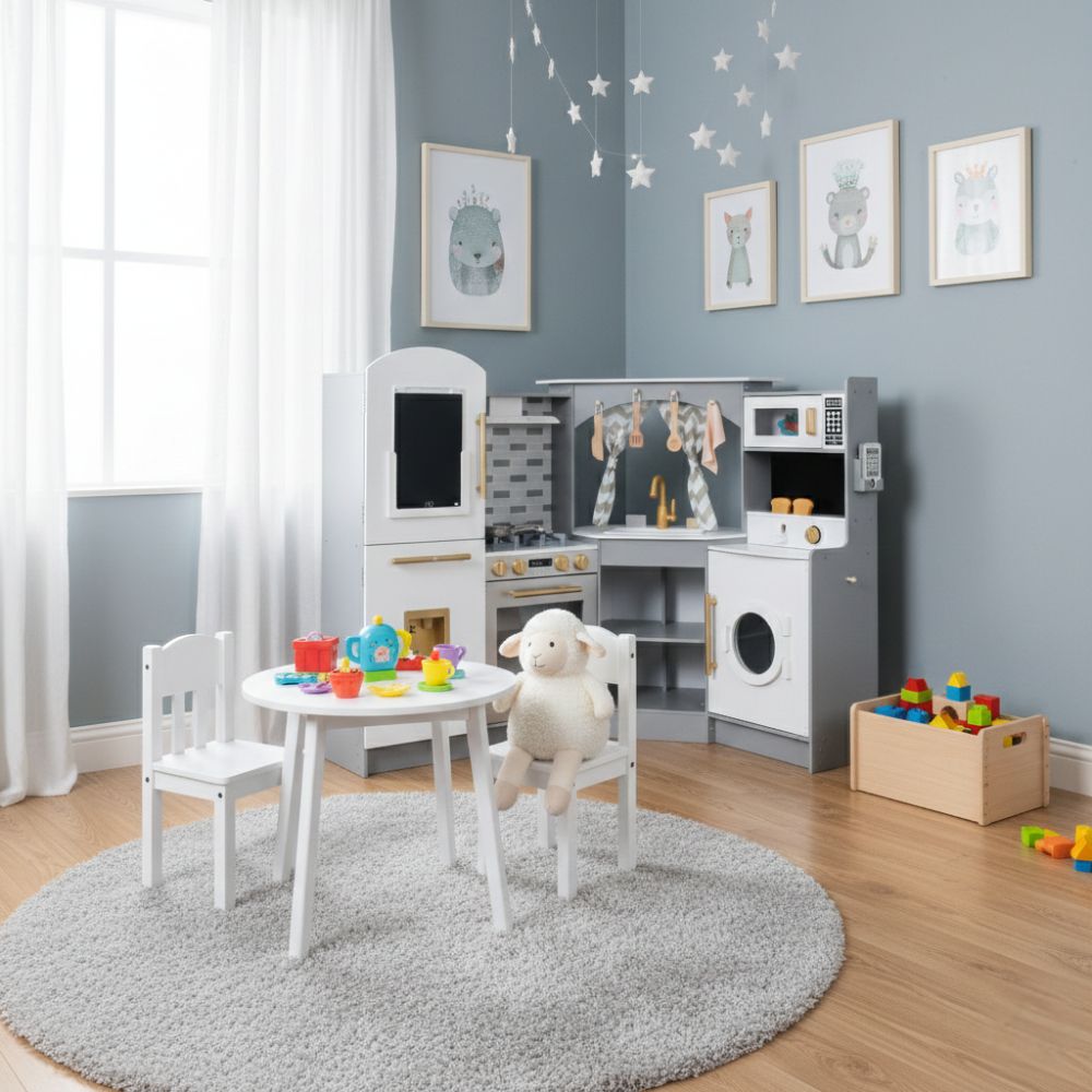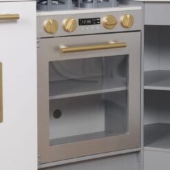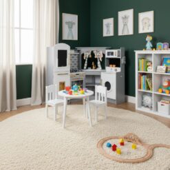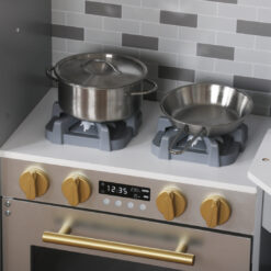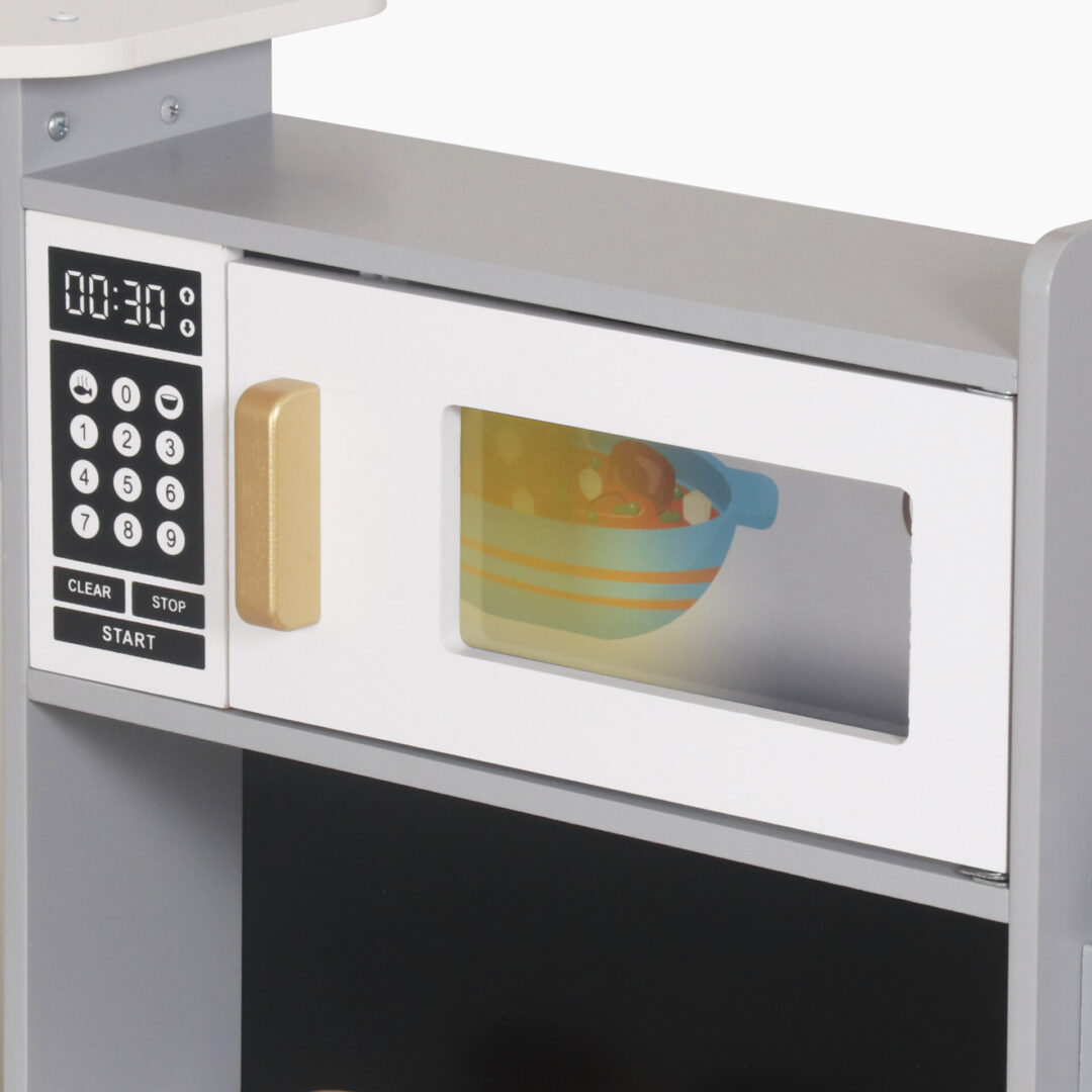 מטבח אלקטרוני מפואר מעץ לילדים , בצבע אפור, מקרר בר מים עם צלילים, מכונת כביסה עם אורות, כיריים חשמליים , תנור, מיקרוגל עם צלילים, כיור עם ברז מים עובד, טלפון ולוח לכתיבה