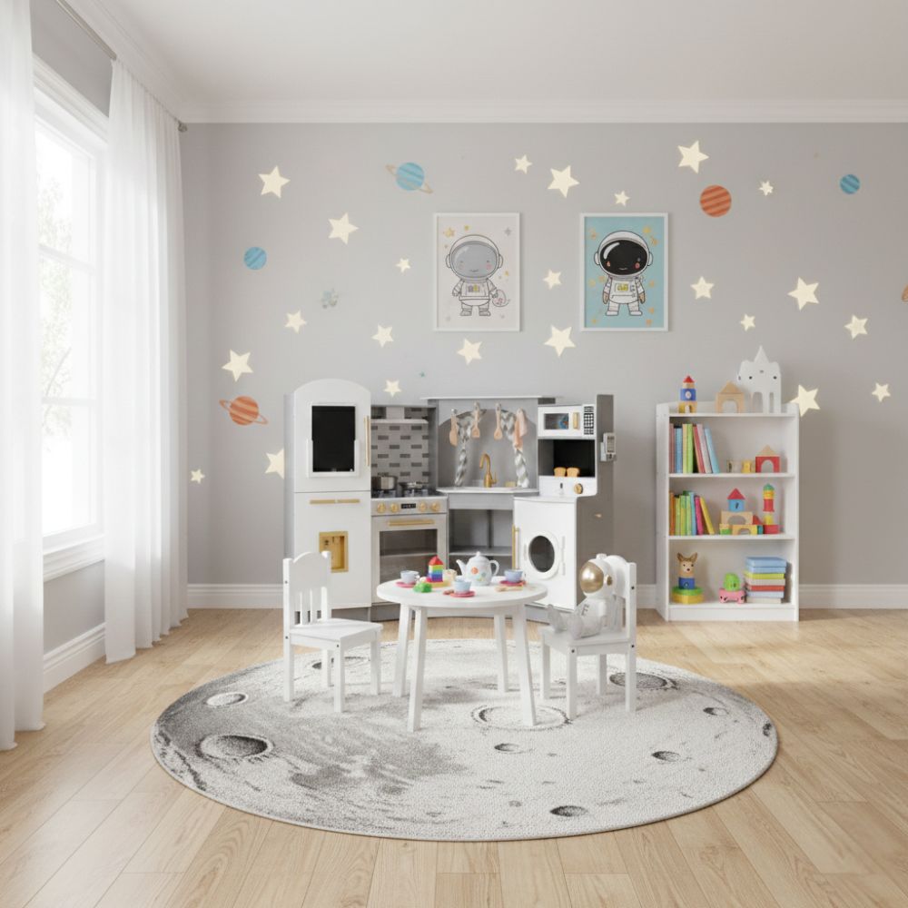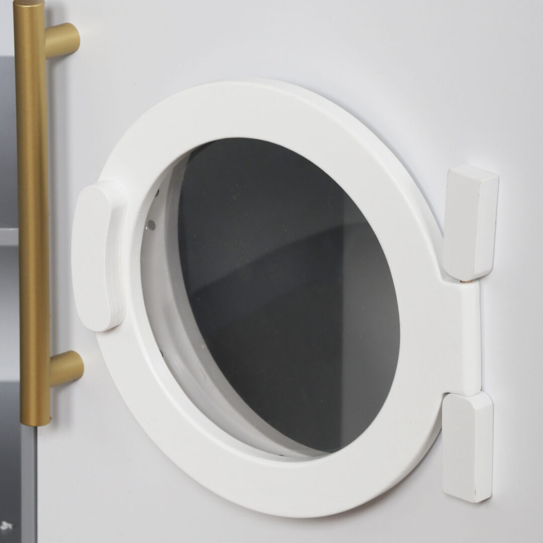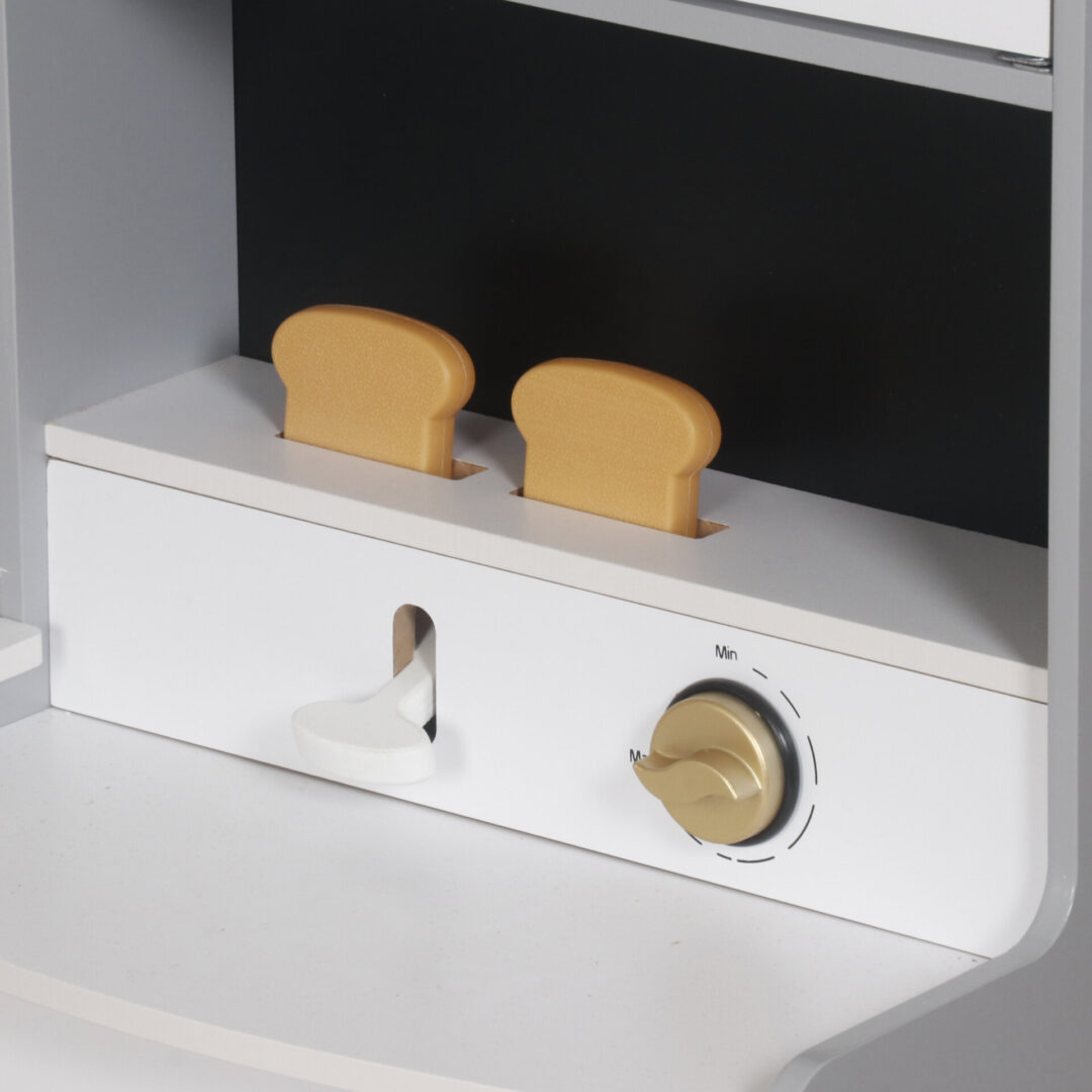 מטבח אלקטרוני מפואר מעץ לילדים , בצבע אפור, מקרר בר מים עם צלילים, מכונת כביסה עם אורות, כיריים חשמליים , תנור, מיקרוגל עם צלילים, כיור עם ברז מים עובד, טלפון ולוח לכתיבה