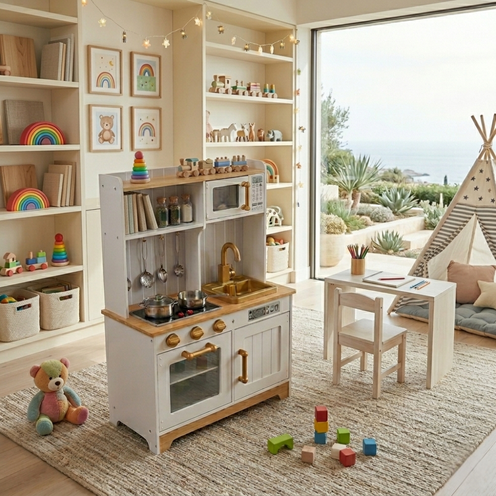 הכירו את מטבח דגם “שרון”, מטבח עץ מעוצב המביא איתו משב רוח רענן, נקי ואלגנטי לחדר הילדים. זהו לא רק משחק דמיון, אלא פריט עיצובי מרשים שנבנה באיכות הגבוהה ביותר כדי להעניק לילדיכם שעות של הנאה, יצירתיות ופיתוח מיומנויות.