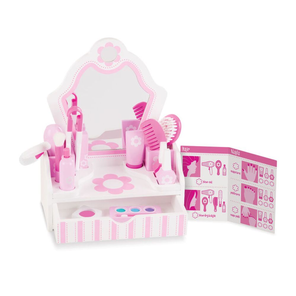 הערכה כוללת 18 חלקים איכותיים הכוללים שולחן איפור מעץ בצבעי לבן וורוד עם מראה ובקופסת אחסון, וכן אביזרים מעץ לילדים כגון מייבש שיער, ספריי לשיער, מחליק שיער, בקבוק לושן, שפתון, שני לקים, סומק, מברשת איפור, צללית ואפליקטור, מסרק ומברשת שיער.