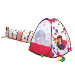📦 הערכה כוללת: אוהל משחק, מנהרה מתחברת ו-100 כדורי משחק.