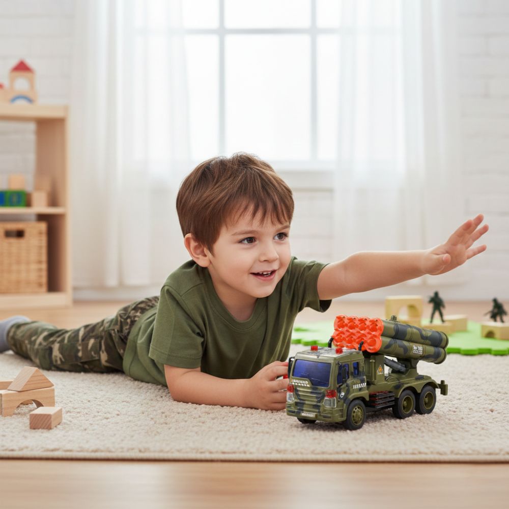 משאית טילים צבאית אינטראקטיבית – דגם עוצמתי עם אורות, צלילי קרב ומערכת שיגור