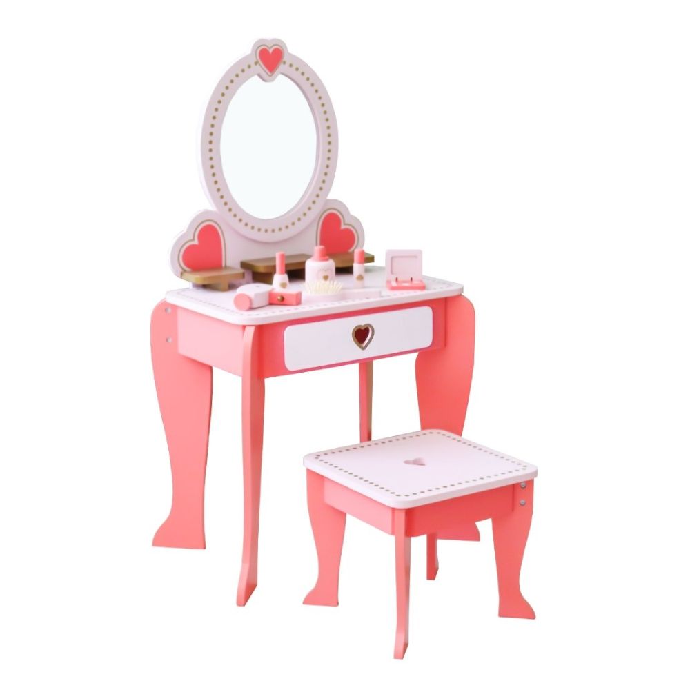 שידת איפור מעץ מדהימה לילדים כולל שרפרף ומראה, מגירת אחסון ואביזרי איפור מעץ לילדים