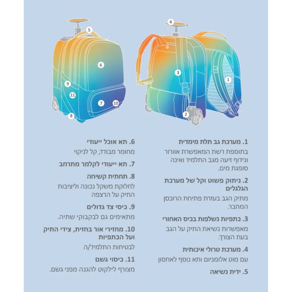 תיק טרולי ייחודי מבית קל גב עם מערכת ניתוק חדשנית – ילקוט אורטופדי קל + תיק עם גלגלים. כולל מערכת ארגון פנימית FIX לנוחות מקסימלית.